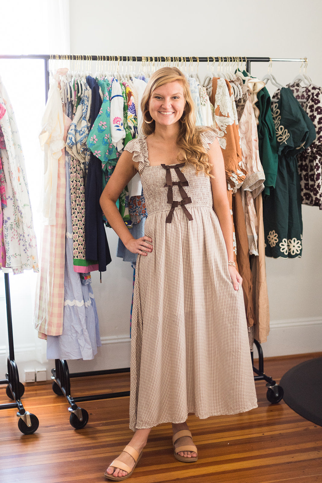 Soft gingham, flirty ruffle sleeves, and darling chocolate bows—this dress is serving up Southern charm with a sprinkle of cottagecore. Smocked on top for a comfy, flattering fit and flowy all the way down. Basically made for twirling on porches or strolling through the farmers market. Fits true to size and is lined. Hannah is in a size small.
