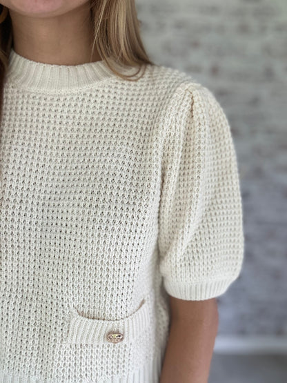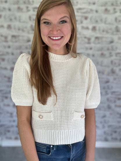 Chic and cozy meet in this textured knit sweater top, designed with a flattering cropped fit and feminine puff sleeves. The front features decorative faux pockets with gold button accents for a touch of charm. Perfect for dressing up your favorite denim or layering with a skirt for an elevated everyday look. Fits true to size. Hannah is 5’9 in a small.