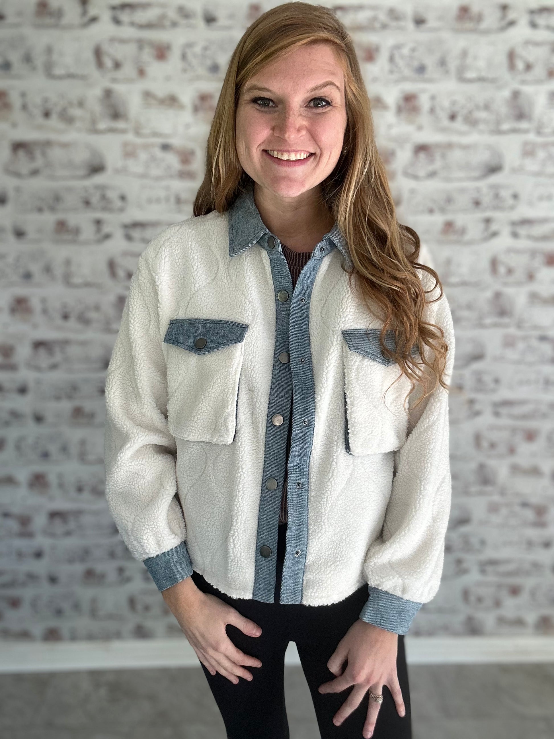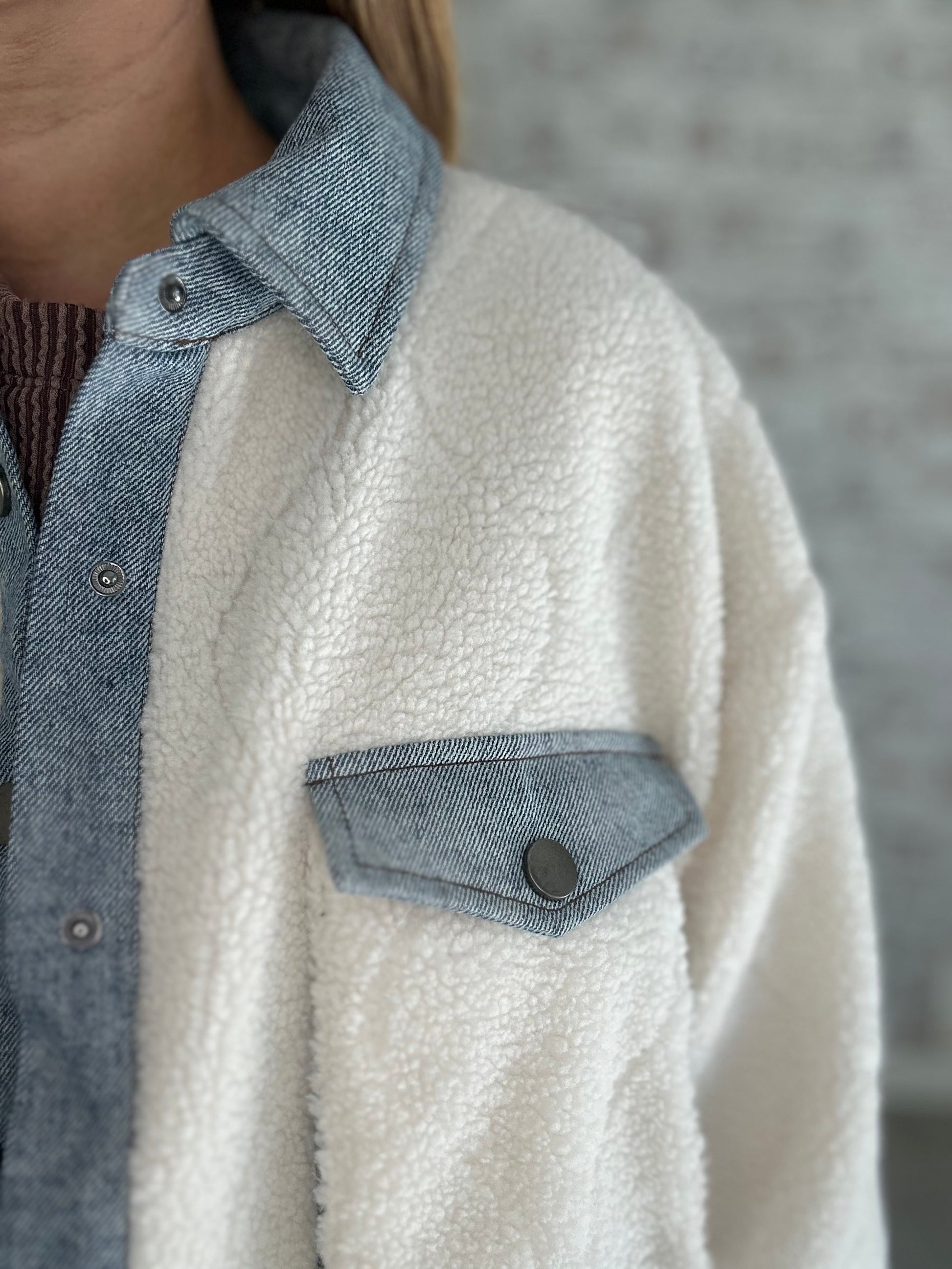Stay warm and stylish this season with our Sherpa Jacket with Denim Trim, a cozy must-have for any wardrobe. This versatile jacket combines the plush softness of sherpa fabric with the classic look of denim, creating a blend of comfort and trendiness that’s perfect for layering.