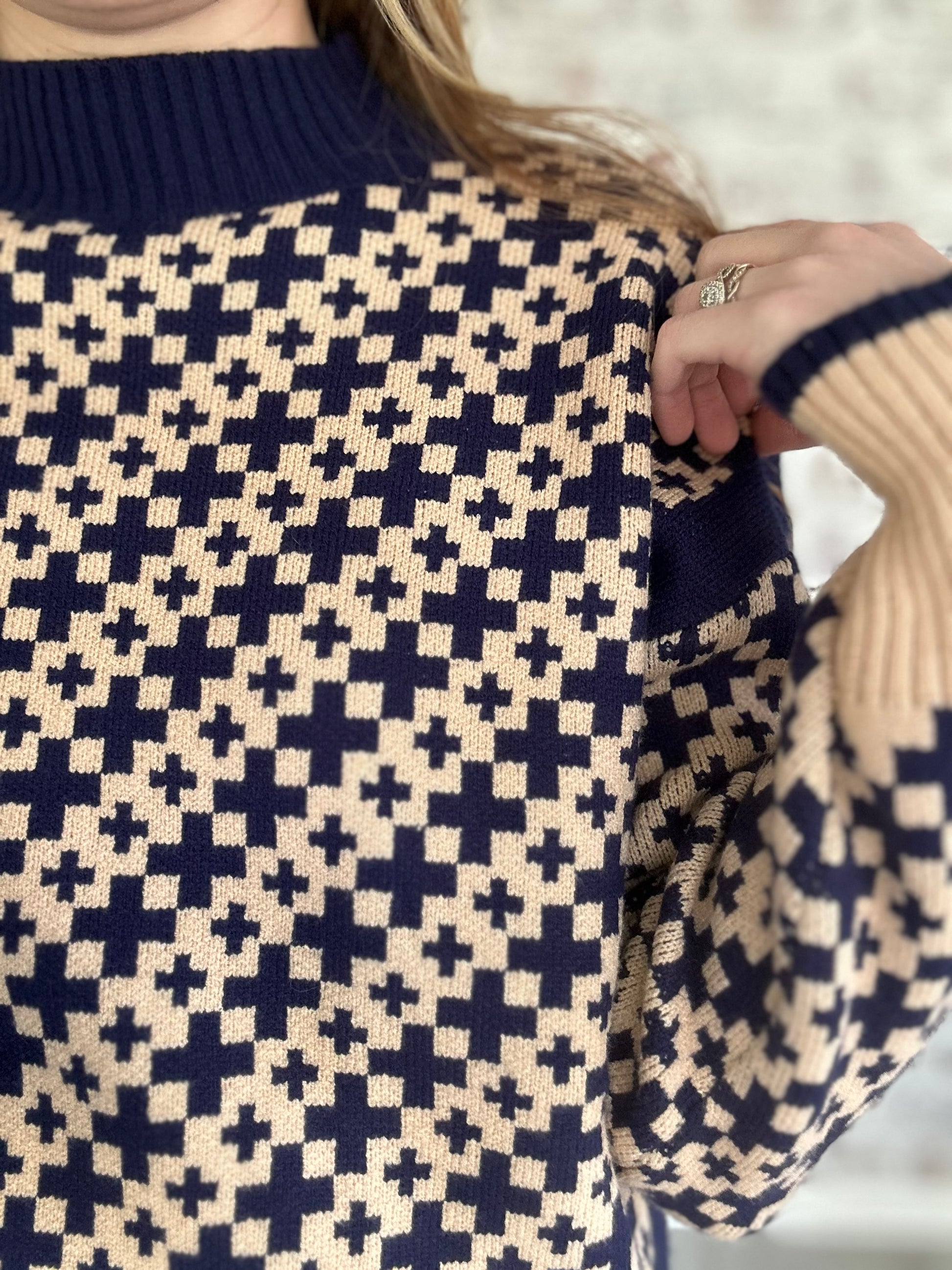 This chunky sweater features a drop shoulder and a mock neck. The creative geometric pattern elevates an everyday basic style. The sweater is oh so soft and has flattering side slits as well. We are big fans of this one!