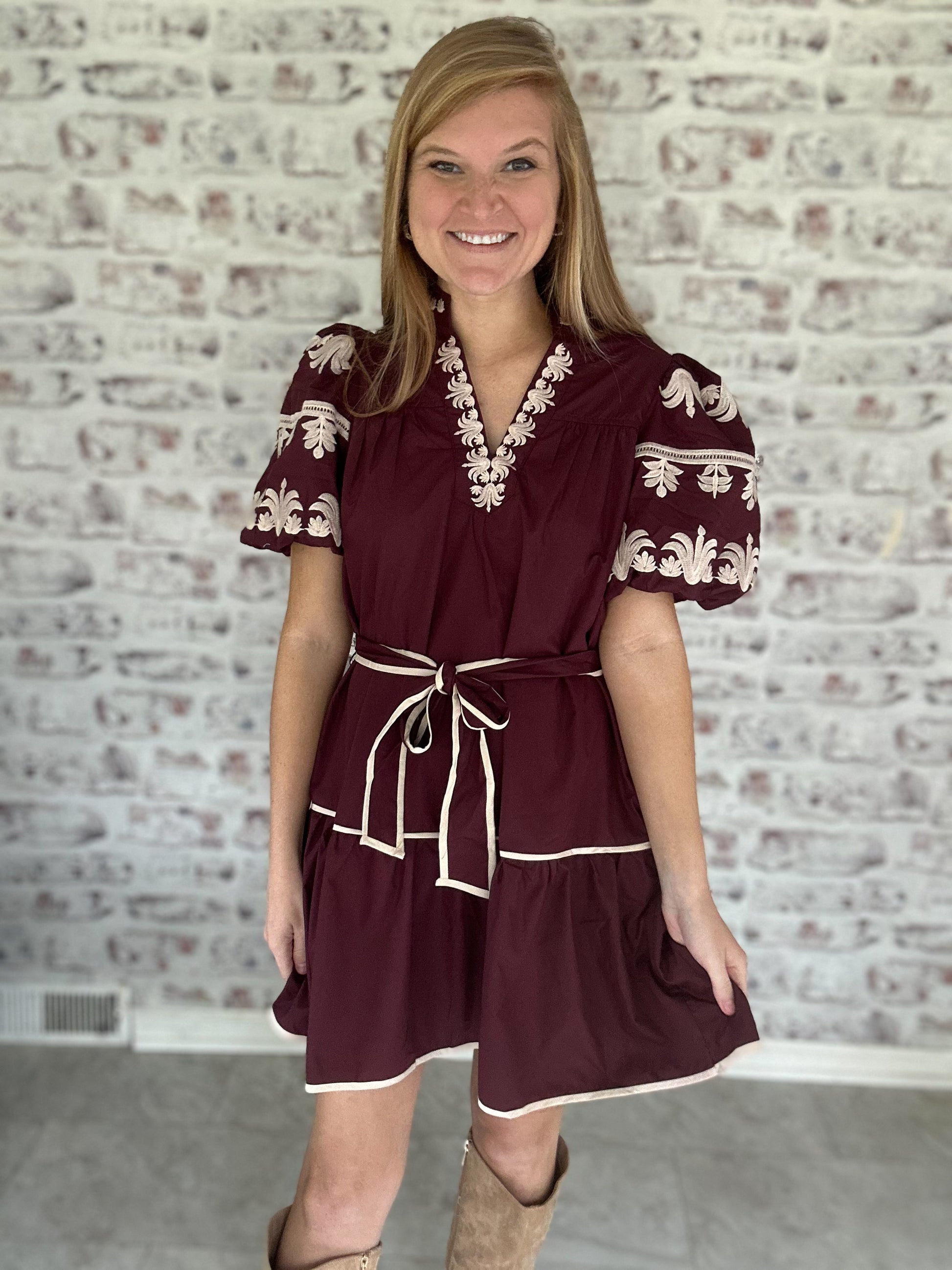 This tiered mini dress is a perfect mix of playful and polished. The deep wine hue is beautifully accented with cream embroidery and trim, giving it a refined, boutique feel. Featuring puff sleeves, a flattering belted waist, and a scalloped embroidered neckline, it’s effortlessly feminine and flattering. Whether you’re heading to brunch or a fall event, this dress brings just the right amount of charm and sophistication.