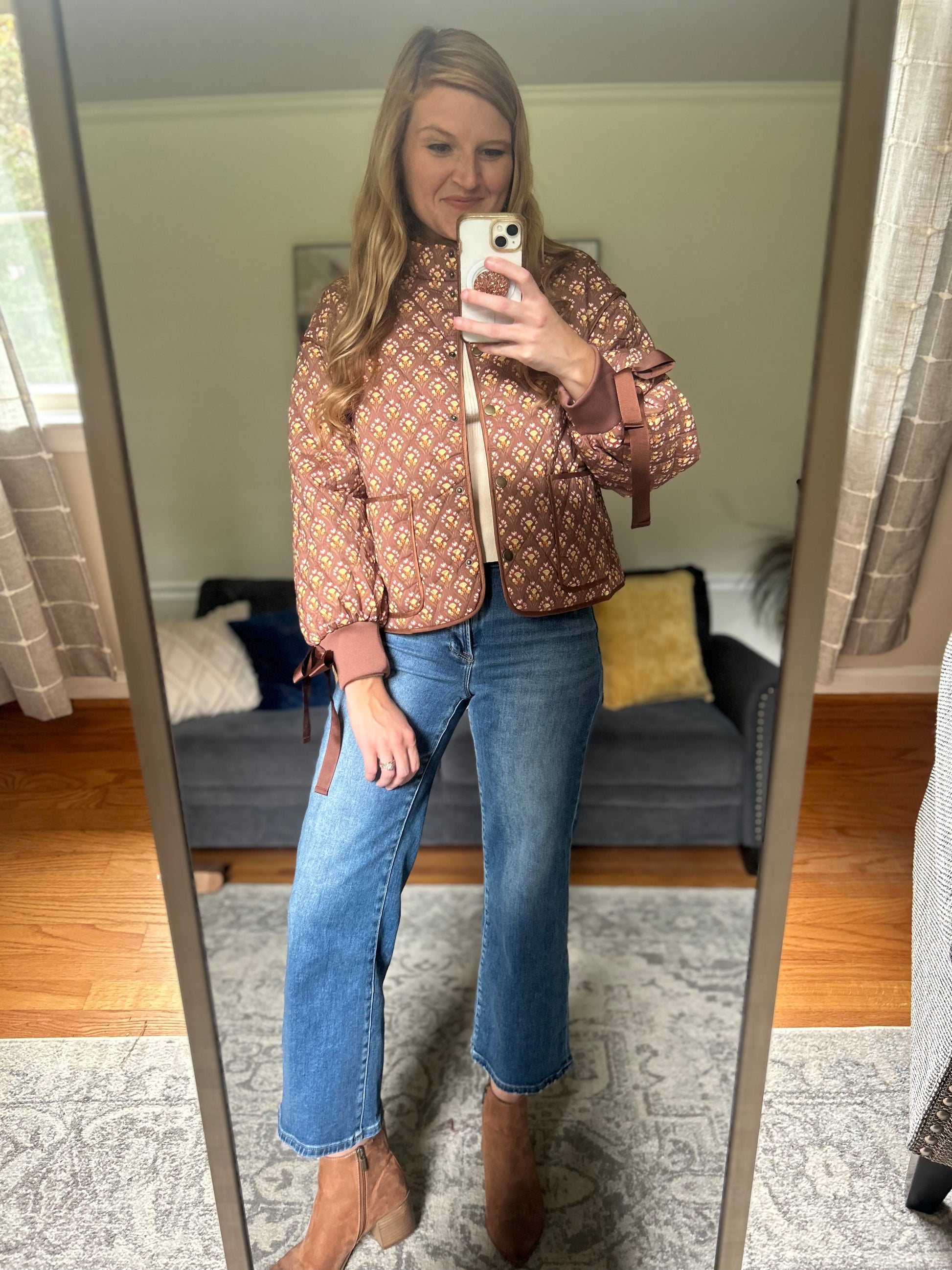 Stay cozy and stylish in this quilted jacket, the perfect lightweight layer for fall and beyond. Designed with a classic snap-front closure, practical pockets, and feminine bow-tie sleeve details, this jacket blends everyday comfort with boutique charm. Easy to pair with jeans or dresses, it’s an effortless piece you’ll reach for season after season. First true to size and Hannah is in a size small.