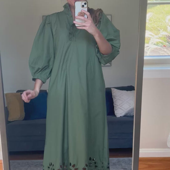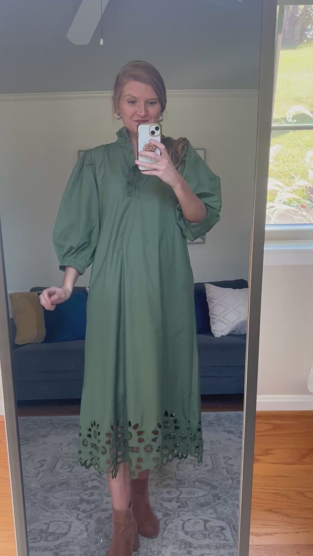 We love how classy and easy this dress is! The scalloped bottom with cut-out detail gives it a little bit of flair, and we LOVE the collar. Dress is lined with pockets and can easily be dressed up or down. Add a belt to give yourself some shape. Dress is generous in size, and one of our customer favorites!
