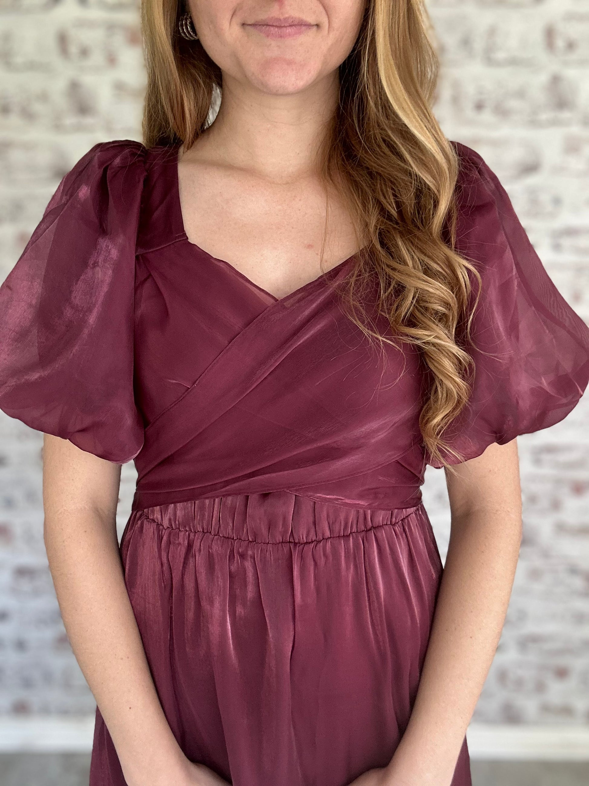 This beautiful dress is perfectly festive and incredibly classy. The bodice has a wrap feature that allows you to tie it in the front or the back. The fabric is delicate and light weight and will make you feel like a million bucks! We highly recommend this dress for any Holiday event or winter wedding!