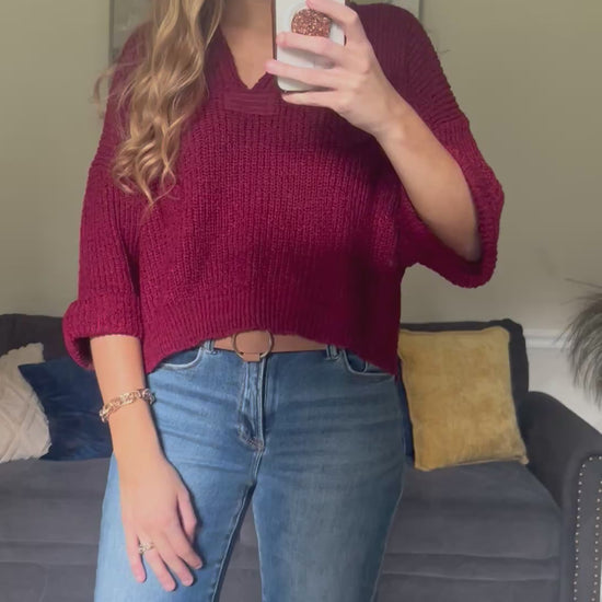 A comfy-chic staple you’ll love to wear. This knit sweater features a relaxed fit, cropped length, and wide sleeves with a casual rolled cuff. The soft texture and easy V-neckline make it perfect for pairing with high-rise denim. Has a slouchy, oversized fit. Hannah is in a size small/medium.