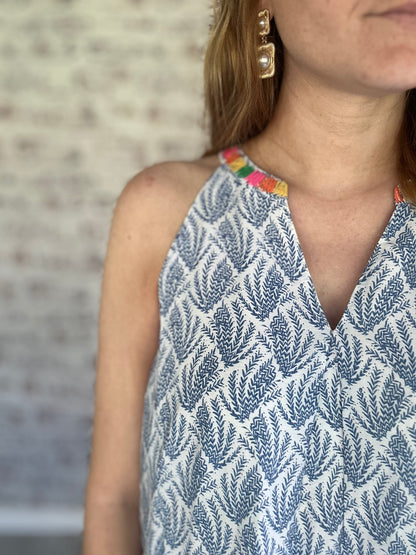 Say hello to your new sunny day obsession! This dress brings all the girly, carefree vibes with its dreamy blue palm print and pops of color that feel so summer. The relaxed shift fit keeps it comfy, while the colorful trim adds just the right amount of fun. Throw it on with sandals for brunch or dress it up with wedges for your next weekend adventure. Either way, she's basically a compliment magnet. Dress is lined and fits true to size. Hannah is in a size small and is 5’9!